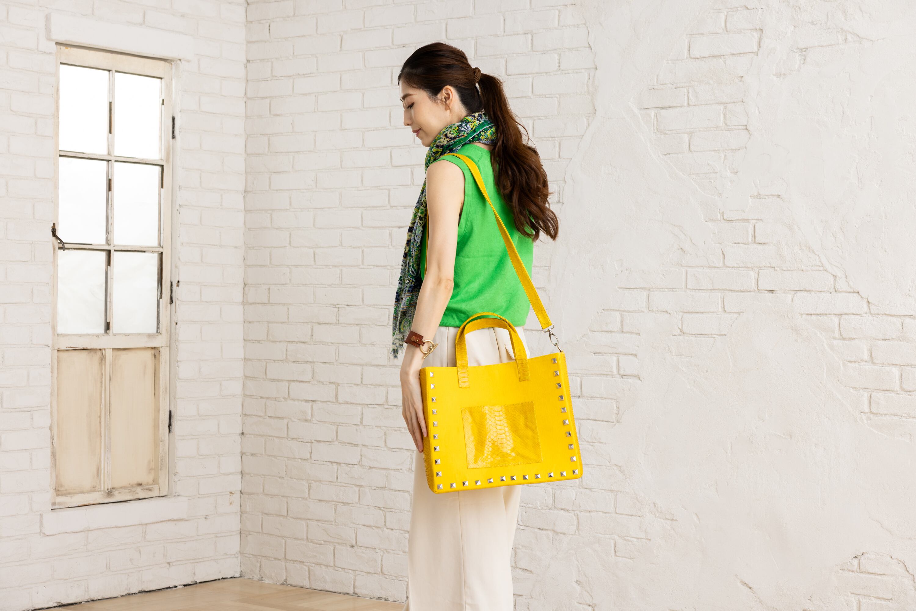 スタイリッシュかつ実用的なViaggio(ヴィアッジョ)のスタッズ付きトートバッグ。どんなシーンにも幅広く対応する逸品です。上質なパイソンレザーとカラフルなキャンバス生地を使用し、耐久性にも優れています。内側にはポケットも充実しており、荷物の整理もラクラク。シンプルなデザインながらも、スタッズがアクセントとなりお洒落度もアップします。