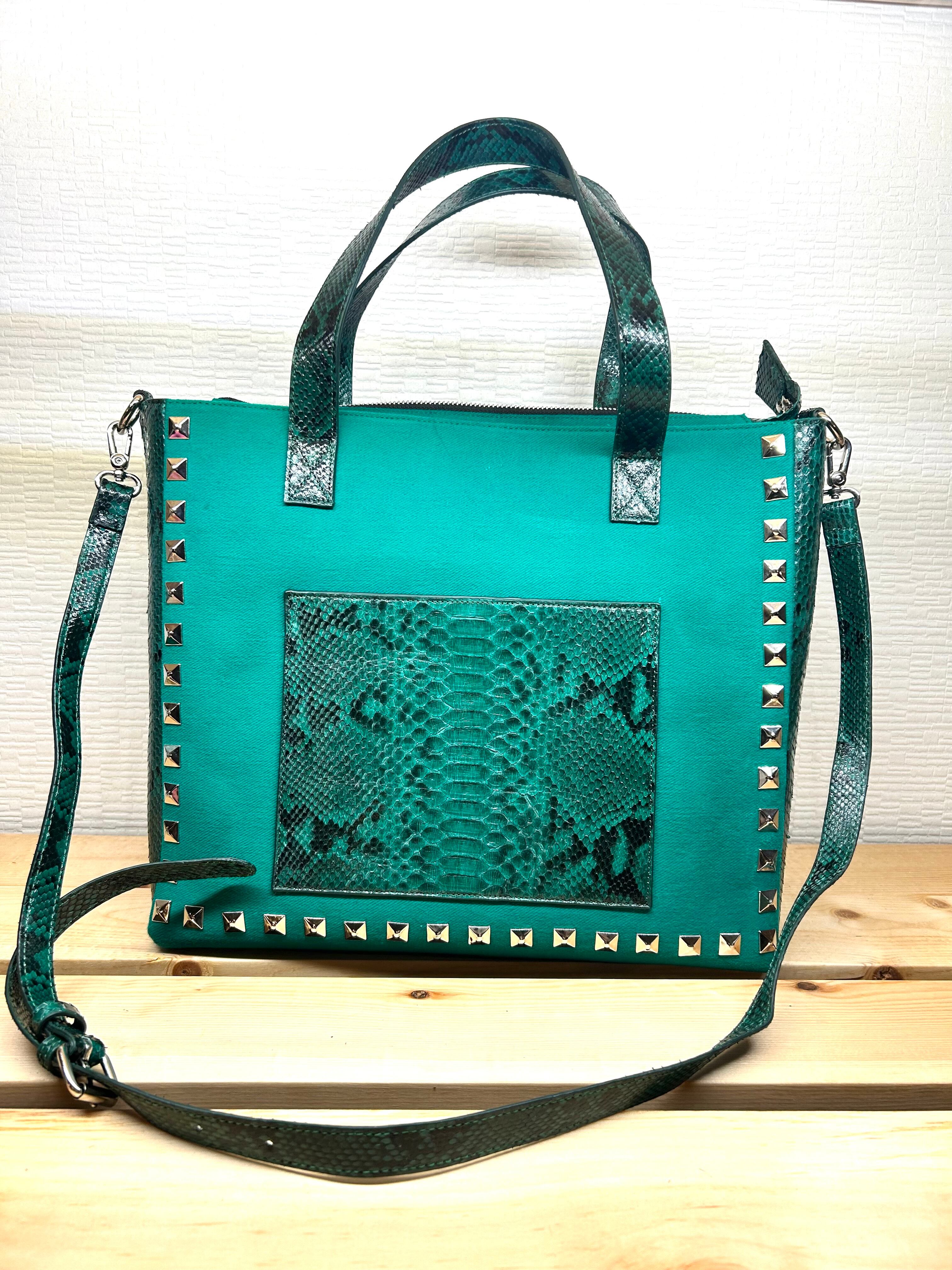 スタイリッシュかつ実用的なViaggio(ヴィアッジョ)のスタッズ付きトートバッグ。どんなシーンにも幅広く対応する逸品です。上質なパイソンレザーとカラフルなキャンバス生地を使用し、耐久性にも優れています。内側にはポケットも充実しており、荷物の整理もラクラク。シンプルなデザインながらも、スタッズがアクセントとなりお洒落度もアップします。